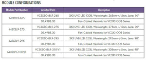 M3X3L9 Seriesis a UV LED module comprised of a VC3X3 UV LED COB and a fan-cooled heatsink for a complete, validated product ready for testing and integration. Utilizing the patented 3-PAD LED Flip Chip and Super Pillar MCPCB, the COB array is structured with a high density 9-chip LED array under a single 90° fused silica lens, allowing for focused, high-power illumination.