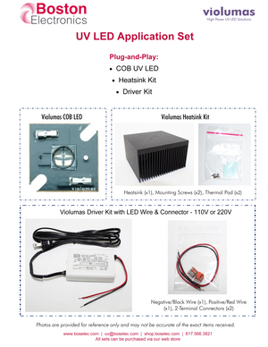 Plug-and-Play UV LED Application Set - Includes LED (chip-on-board - COB), matched heat sink with thermal interface pads and driver kit including power supply, plug, connector and wires. We have matched the components for a plug-and-play Application Set.  Everything is in the box to quickly be up and running with instructions