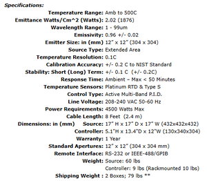 Our extended area sources (IR-150 has 12 x 12 inch area) are flat plate emitters with special high emissivity coating providing 0.96 average emissivity. Extended area sources provide large target with high radiant intensity for application where a cavity blackbody is too small.