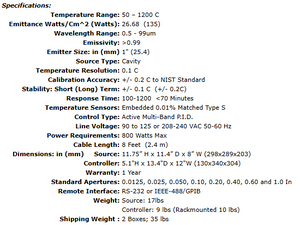 The 20º tapered - recessed - cone, surface emissivity, and cavity aspect ratio combine to provide blackbody radiation by multiple reflection, absorption and re-emission of it's thermal energy. The thermal energy of the cavity is provided by a ceramic-sealed heater coil that uniformly heats the cavity cylinder to temperatures from 50 º C to 1200º C.