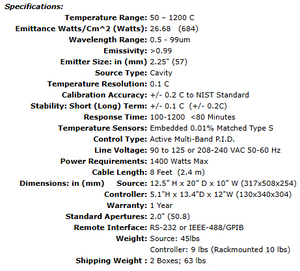 The IR-574 is an ideal source for the Near (1-3 um), Mid (3-8) and Far (8-30+ um) infrared bands. The IR-574 extends the temperature range to 1200ºC by using special SiC cavity materials with high emissivity.