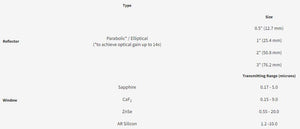 The IR-Si207-P-1 emitters are mounted in a 1 inch parabolic reflector for extremely efficient collimation of energy. The IR-Si207-E-1 emitters are mounted in a 1 inch elliptical reflector with an external focal point that is 1/2 inch in front of the clear aperture.